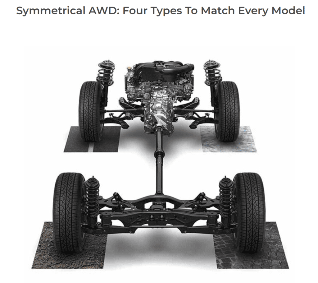 Penggunaan Symmetrical – AWD pada mobil – mobil Subaru memberikan kelebihan yang mungkin tidak dimiliki mobil dengan penggerak roda baik depan / Front Wheel Drive (FWD) maupun Penggerak roda belakang / Rear Wheel Drive (RWD), antaranya