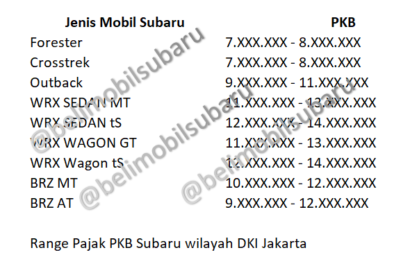 Pajak mobil (PKB) Subaru berdasarkan data yang admin belimobilsubaru lihat berkisar dari 7 juta hingga 14 juta berikut tabel kisaran pajak mobil Subaru yang di rangkum oleh admin belimobilsubaru untuk PKB Jakarta diluar pajak progresif (jika ada). Kisaran harga juga disebabkan nilai kena pajak dari tiap – tiap wilayah samsat yang berbeda satu dengan yang lainnya.